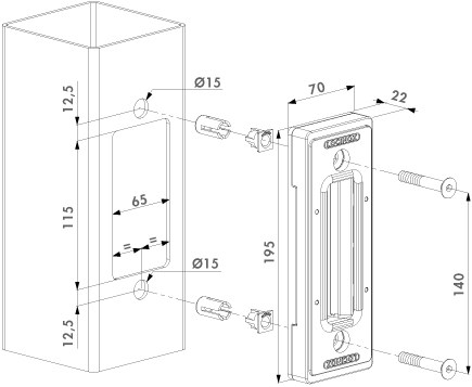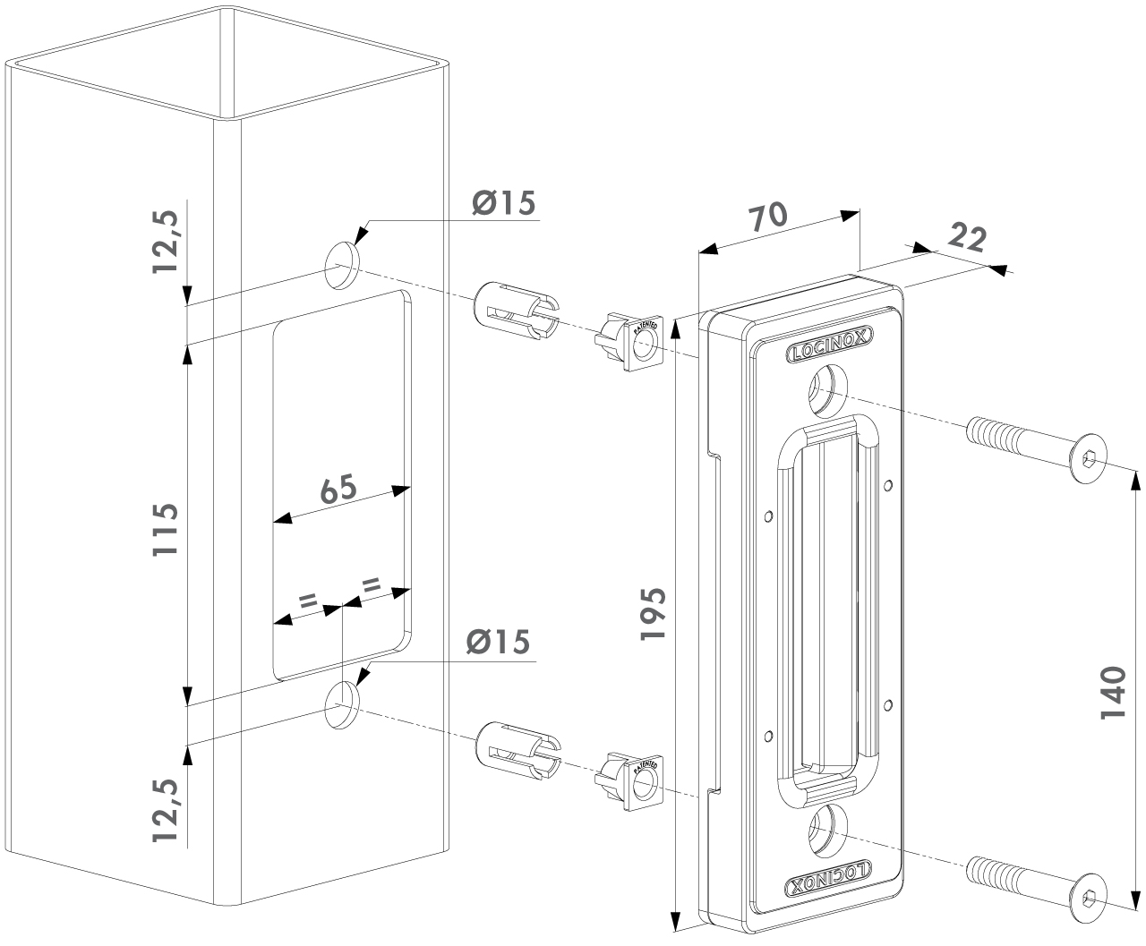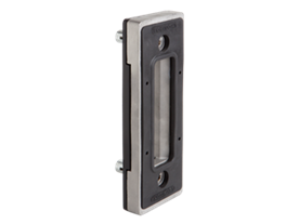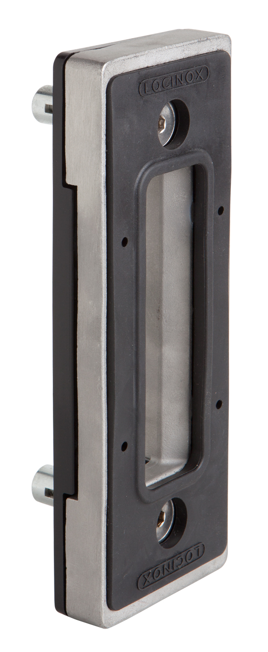 Cerradero de acero inoxidable para perfiles planos. El cerradero es autoajustable con 9 mm a la derecha y a la izquierda para garantizar un anclaje seguro de la puerta corredera. El caucho evita averías en la puerta